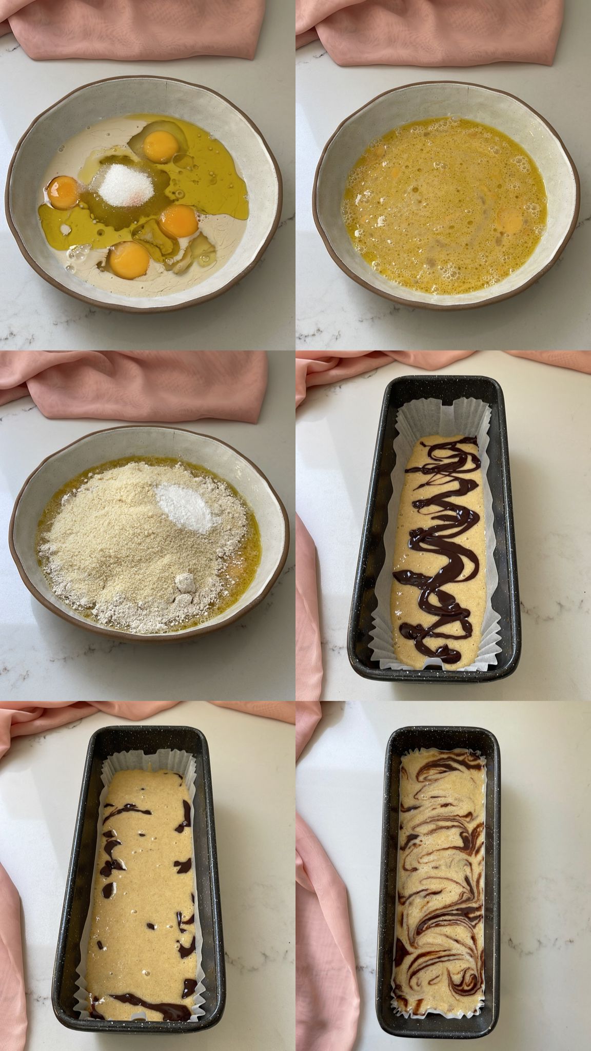 הגיע הזמן להכין את מערבולות השוקולד המהפנטות: נשפוך בערך 1/3 מבלילת העוגה אל תבנית האפייה ומעליה נזלף את השוקולד המומס שלנו. נחזור על הפעולה שוב – נשפוך מעט מבלילת העוגה ומעליה את השוקולד המומס כשהשכבה האחרונה תהיה בלילת עוגה.