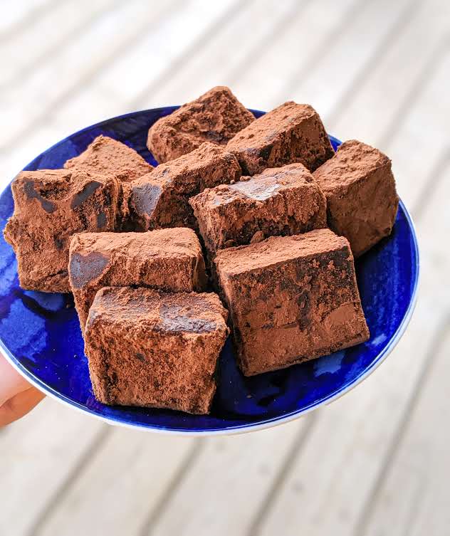 - נשים בצלחת שטוחה את אבקת הקקאו לציפוי הטראפלס. נצפה כל קובייה בקקאו ונצנן לפחות שעה לפני ההגשה.