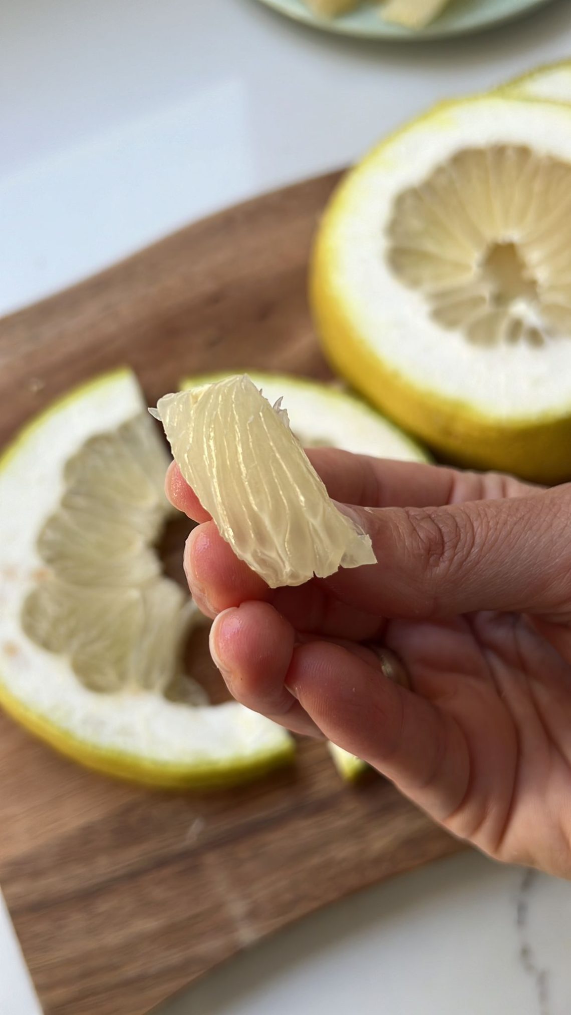 כל פרוסה נחתוך לשני חצאים ובידיים נחלץ ביסוני פומלה מהממים שנכנסים בול אל תוך הפה.