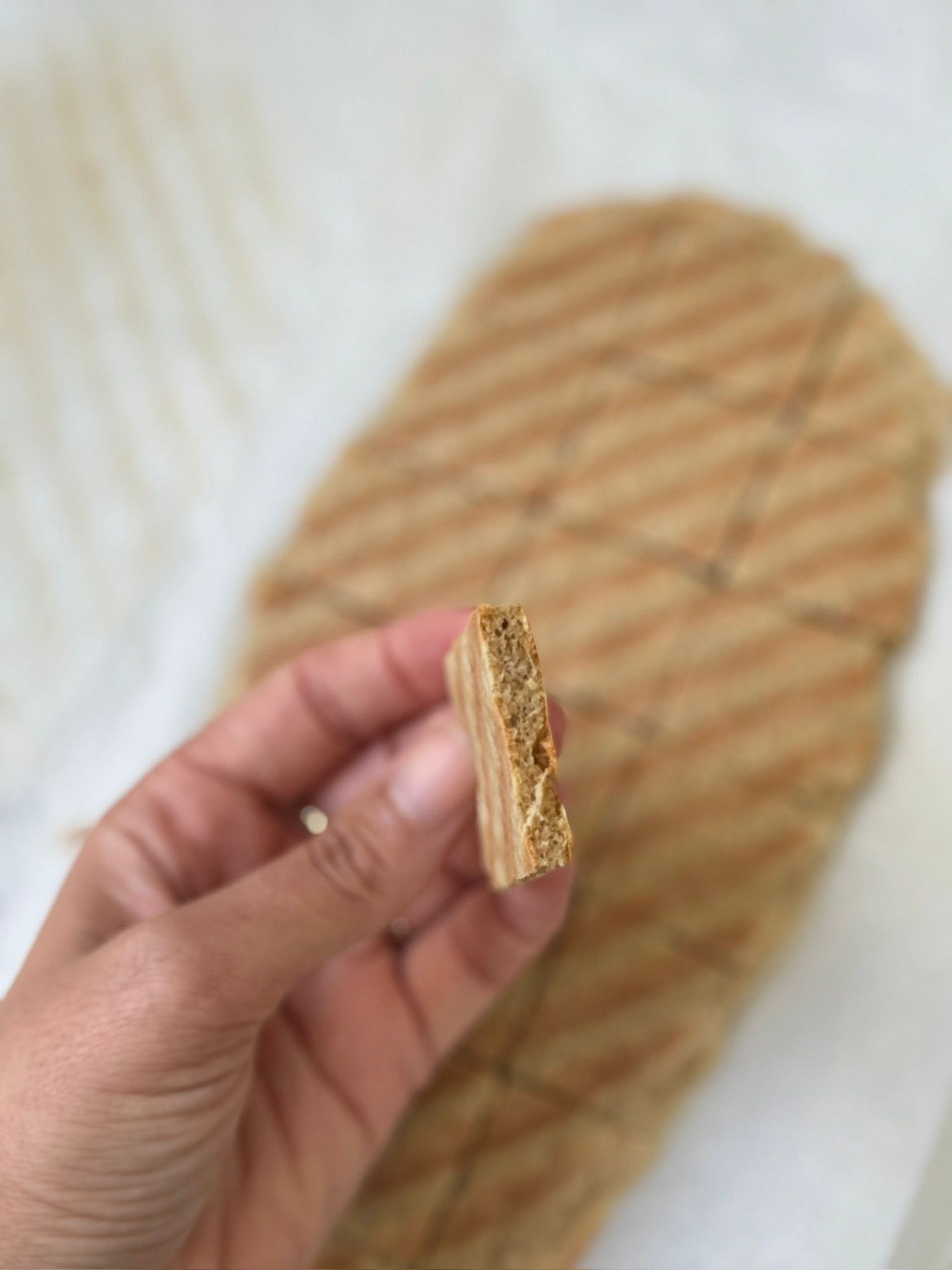 נניח את התערובת על נייר אפייה משומן משני צדדיו ונשטח אותה לצורת מלבן. נכניס את נייר האפייה לטוסטר ונבשל את הפנקייק שלנו כמה דקות עד לקבלת פנקייק מבושל ותפוח שיש עליו פסי צריבה יפים.