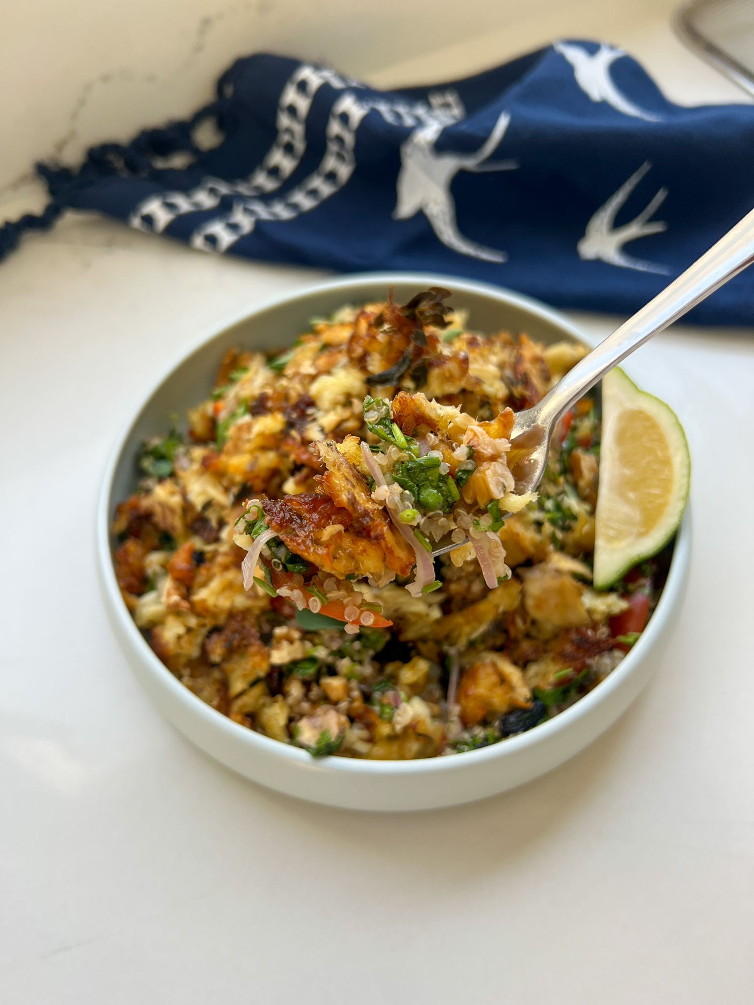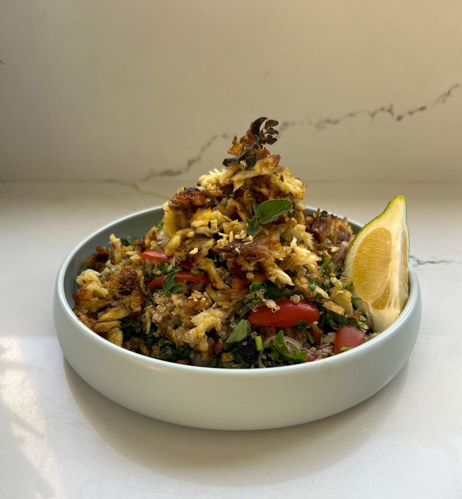 סלט קינואה עם קריספי דג אמנון ישראלי וטרי,