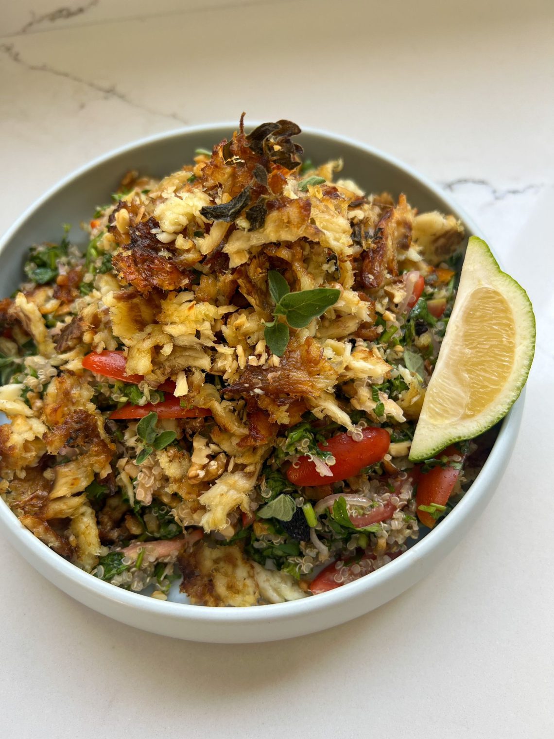 סלט קינואה עם קריספי דג אמנון ישראלי וטרי,